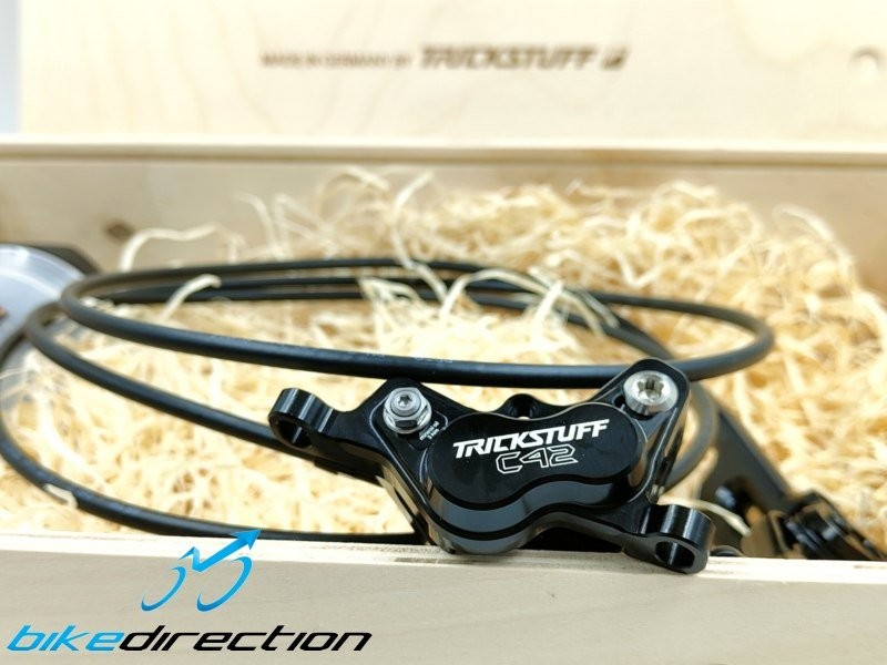I freni a disco Trickstuff Direttissima black a 4 pistoni sono pensati per chi vuole potenza, dosaggio finissimo e controllo anche con pesi elevati delle e-MTB.